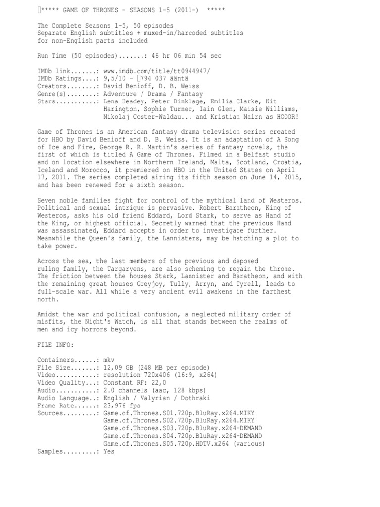 Game Of Thrones Seasons 1 5 Info Television Episodes Fantasy Television Series