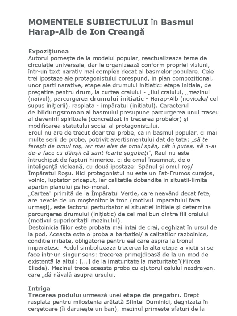 Momentele Subiectului In Basmul Harap Alb De Ion Creangă